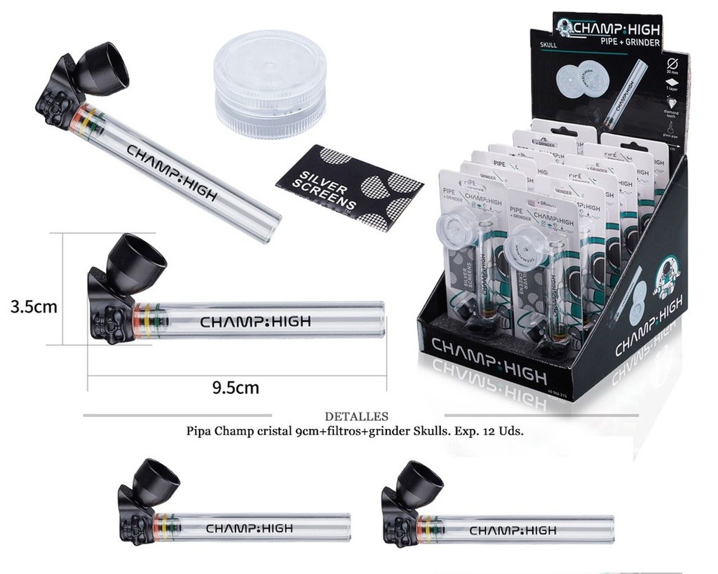 PIPA CRISTAL CHAMP 9CM+FILTROS+GRINDER SKUL 12 UDS